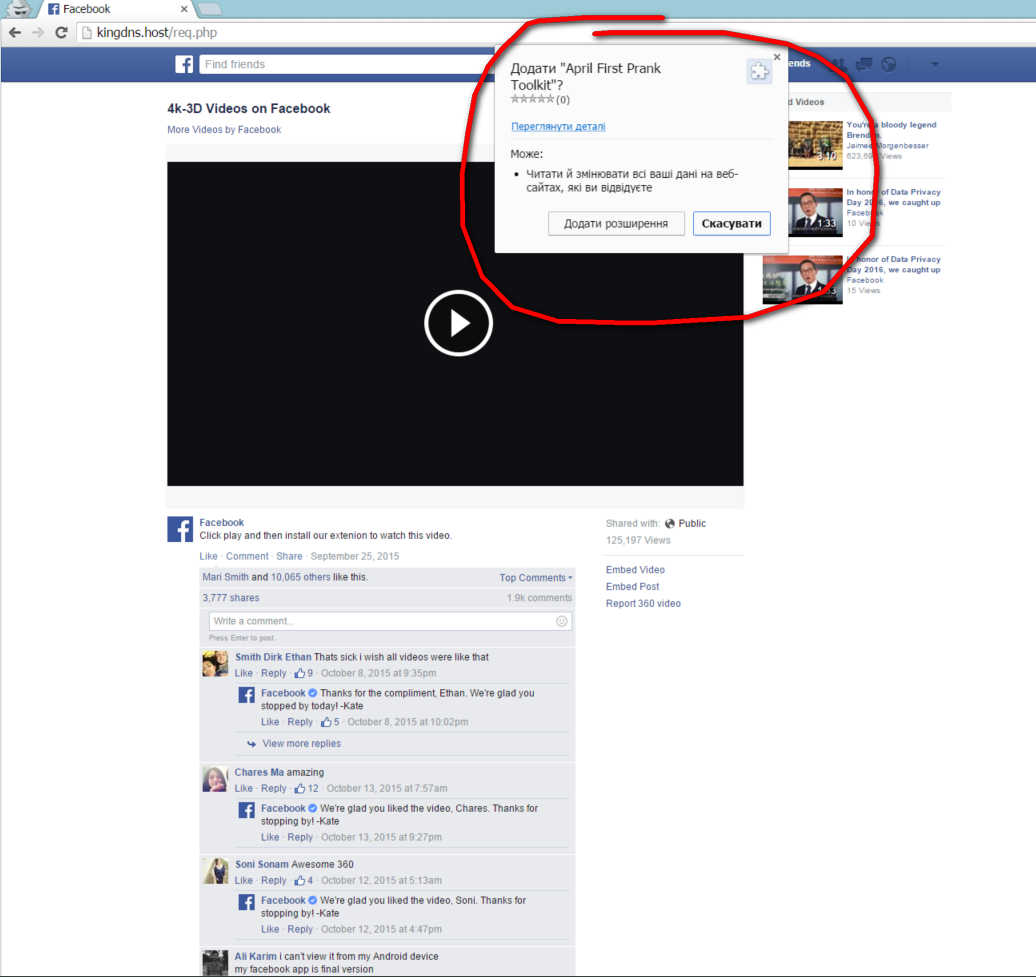 Вірус і справді активно поширюється: надсилає повідомлення від ваших друзів та позначає у дописах, де підставляє фото вашого друга. За посиланням ви потрапляєте на сайт-підробку, який виглядає як Facebook, а там — нібито якесь відео, щоб подивитись яке вам пропонують встановити розширення. Ось тут і криється проблема — розширення просить дозвіл “читати й змінювати всі ваші дані на веб-сайтах, які ви відвідуєте”.