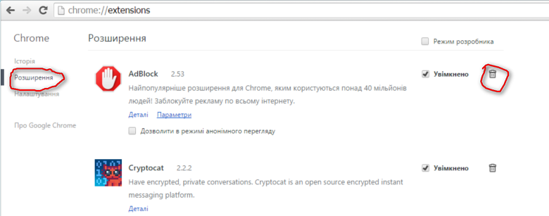 2. Перевірте, які розширення встановлені у вашому браузері та видаліть всі незнайомі або якими не користуєтесь. Для цього у Chrome або Mozzila Firefox зайдіть у “налаштування” — “розширення”.