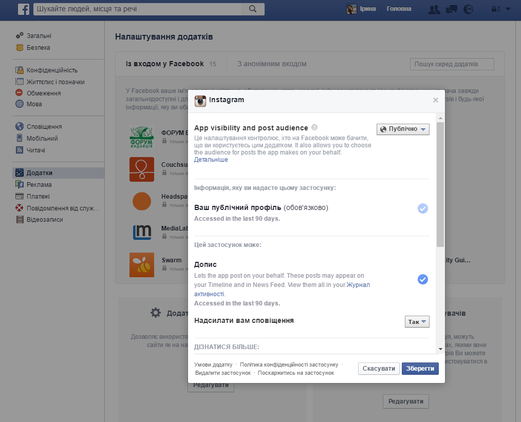 Ми особливо рекомендуємо відмовлятись від додатків, які можуть надсилати сповіщення вашим друзям від вашого імені (напевно кожен отримувати щось таке — “Ваш друг … запрошує вас зіграти у гру …”), а також ті, що можуть робити пости від вашого імені. Виняток — якщо це додаток Instagram, Twitter тощо, яким ви довіряєте і справді хочете, щоб вони могли автоматично переносити ваші пости на вашу сторінку Facebook.