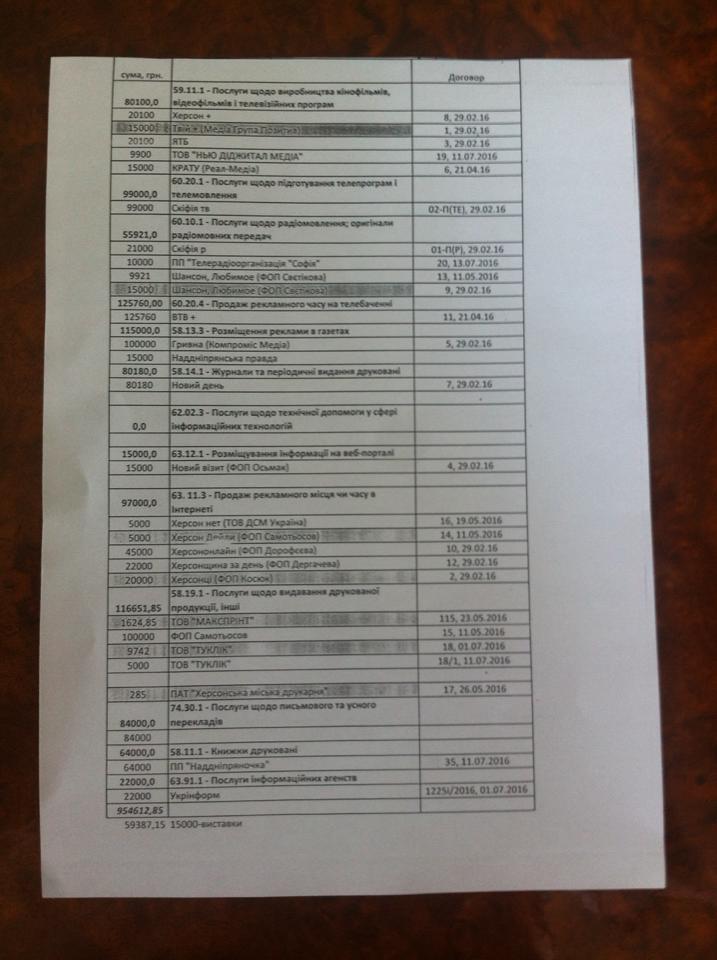 Додаток 1: Договори Херсонської ОДА на висвітлення та інформаційну політику в 2016 році на суму 955 тис. грн. (зі сторінки в Фейсбук Олександра Шумея)