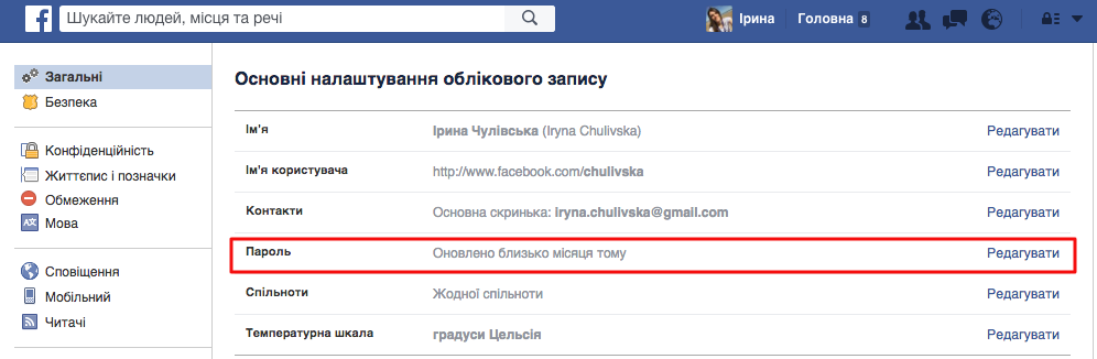 Змінити пароль можна, зайшовши у налаштування вашої сторінки (клік на темно-синій трикутник праворуч зверху, “налаштування”), розділ “загальні”.