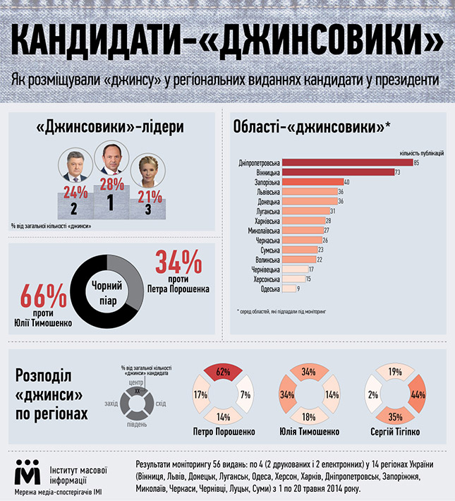 Президентська виборча кампанія, котра буквально прогуркотіла над Україною (через її передчасний та скорочений перебіг) явилася українцям передусім у масі замовних матеріалів. Інститут масової інформації з допомогою своїх регіональних представників у 14 регіонах України простежив характер джинси в локальній пресі (щоденно моніторилося по дві друковані газети і по два сайти). Найбільш щедрими на публікацію джинси кандидатів у президенти в період з 1 по 20 травня виявилися Дніпропетровськ (85 статей) та Вінниця (73), – пишуть Олена Голуб та Роман Кабачій на "Медіасапіенс".