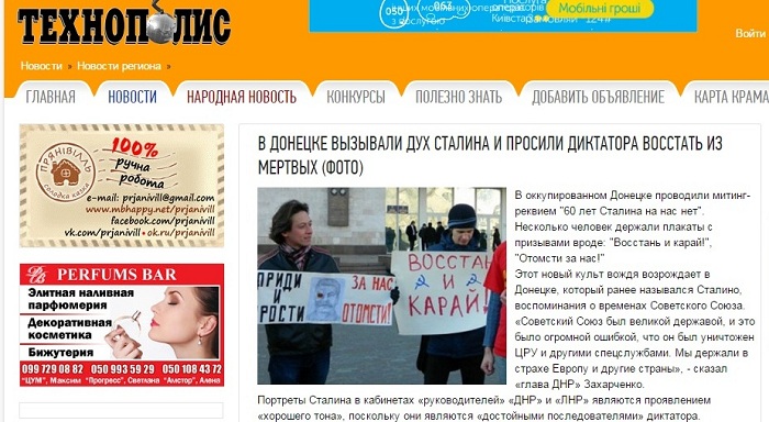 «20 жовтня 2015 року на краматорському сайті «Технополис» з’явилась фейкова новина про те, що мешканці окупованого Донецька провели акцію, на якій «викликали дух Сталіна». На підтвердження цьому були надані фотографії з саркастичної акції «60 лет Сталина на нас нет!» 5 березня 2013 року, яку влаштували прогресивні проукраїнські активісти, аби висміяти «поклоніння» Сталіну та всім радянським символам на Донеччині. Усі люди, які зображені на тих фотографіях вже півтора року як вимушені були виїхати й не можуть безпечно повернутися додому. Вони достатньо впізнавані активісти на регіональному рівні, щоб важко було не знайти їх контакти та перевірити свіжість цієї інформації. Дуже прикро, що під час неоголошеної війни, це роблять журналісти, які перебувають дуже близько до лінії фронту, де питання перевірки інформації й відділення правди від фейкових «новин» має стояти на першому місці. З огляду на цю ситуацію, в мене виникає кілька питань:
