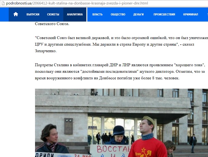 Саме сайт Podrobnosti.ua першим проілюстрував матеріал про повернення культу Сталіна до Донецька застарілими світлинами (також ця новина з'явилася на Контракти.юа). Це була публікація за посиланням на видання «The Telegraph».