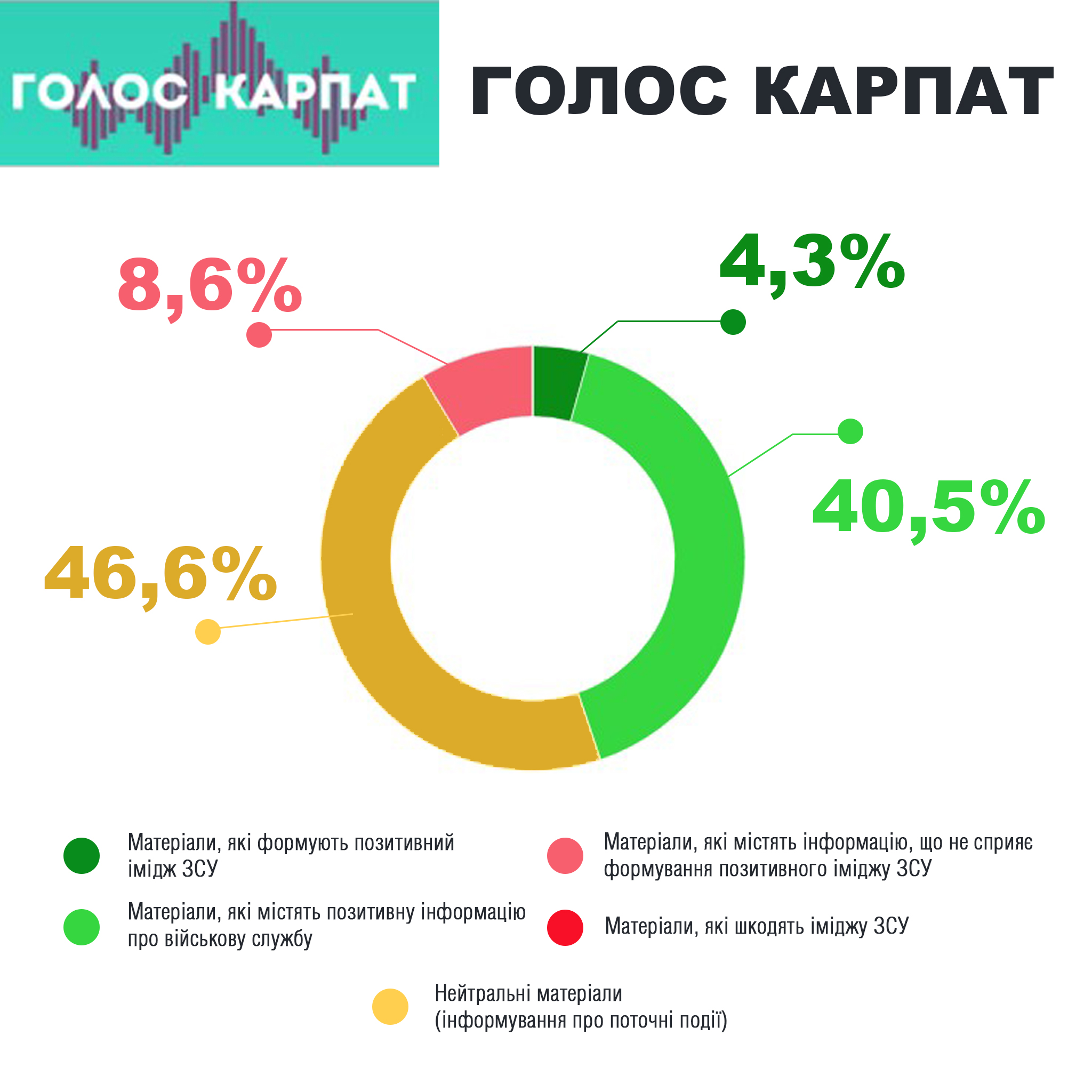 Найбільший відсоток публікацій, які підтримують позитивний імідж Збройних сил України, за вказаний період, вийшли на сайті Голос Карпат. Разом із PMG.ua вони мають і найменший відсоток публікацій, присвячених негативним явищам у армії: загибелі військовослужбовців, хабарництва, пияцтва тощо.