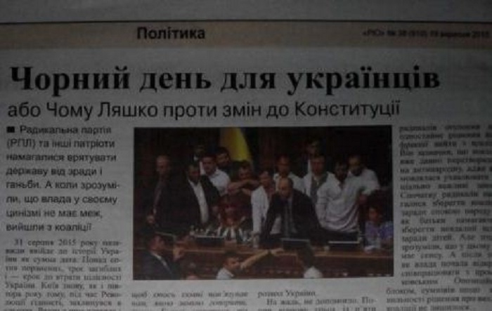 Дві статті із ознаками «джинси» з’явилися про «Радикальну партію Олега Ляшка» у тижневику РІО. У №38 від 19 вересня розміщений матеріал «Чорний день для українців», у якому подано суто позитивна інформація про діяльність лідерів цієї партії, подано розлогі коментарі відносно питання змін до Конституції суто із позиції «Радикальної партії Олега Ляшка»; коментарів представників інших політичних сил немає.