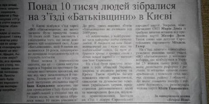Також у тижневику у №38 зафіксовано повідомлення про з’їзд партії ВО «Батьківщина», де, крім фактажу, подані оціночні судження із позитивним вмістом: «Така масовість є свідченням того, що люди довіряють цій політичній силі»; «Це – єдина могутня партія в Україні на противагу політичним проектам». Позначки, що публікація вийшла на правах реклами немає, водночас повідомлень про з’їзди інших політичних сил у тижневику не зафіксовано.