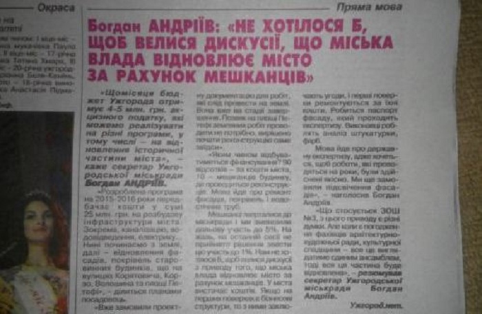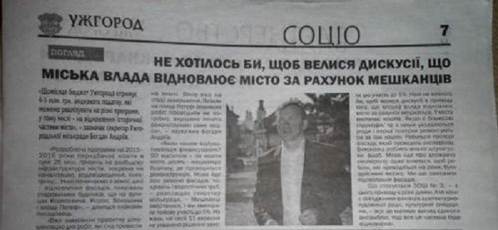 У цьому ж номері газети «Срібна Земля-Фест» розміщена замітка із посиланням на ресурс «Ужгород.нет» – «Богдан Андріїв: «Не хотілося б, щоб велися дискусії, що міська влада відновлює місто за рахунок мешканців».
