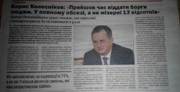 Цей же номер подає розлогий коментар від представника партії «Опозиційний блок» Бориса Колеснікова щодо ситуації із індексацією пенсій. При цьому коментарів представників інших політичних сил не подано.