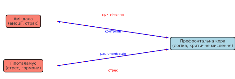 Надмірна активація емоційних центрів може пригнічувати роботу зон, відповідальних за раціональне мислення, і, навпаки, активна робота префронтальної кори може знижувати інтенсивність емоційних реакцій.