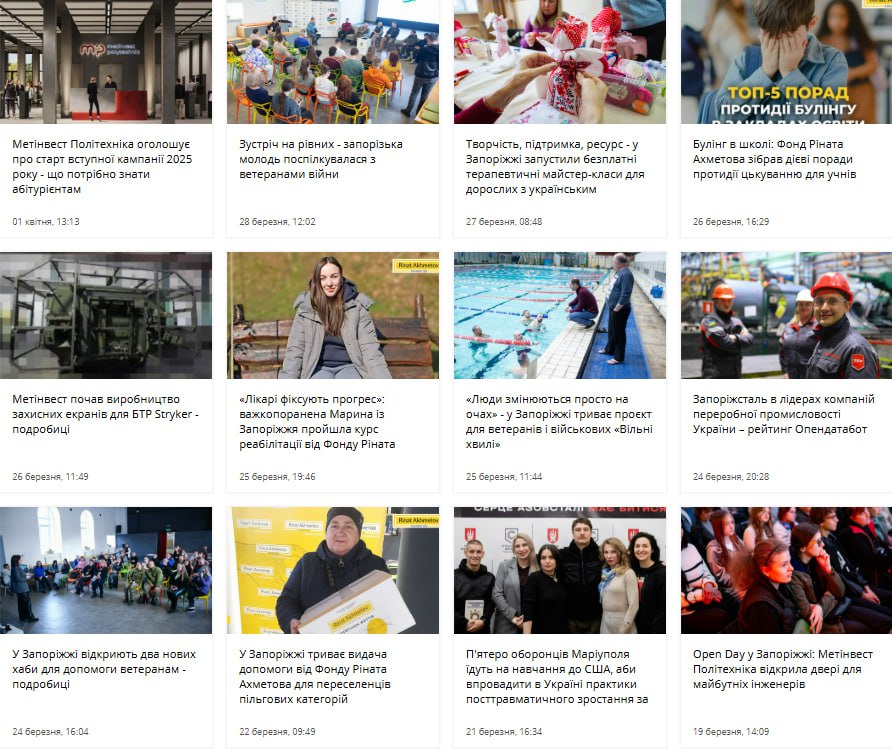 “Метінвест”, який належить Рінату Ахметову, становить у запорізьких онлайн-медіа велику частку публікацій з ознаками комерційної замовності, які або не марковані взагалі, або мають неналежне маркування. Фактично кожна четверта рекламна публікація стосувалася його холдингу або його активів. Найбільше текстів про “Метінвест” і завод “Запоріжсталь”, яким вони володіють, ми знайшли на сайті zprz.city. Не менш ніж 29 компліментарних текстів з ознаками комерційної замовності мали позначку “Новини компаній”. Тут і про те, що “Метінвест назвали найкращим роботодавцем для ветеранів та студентів-інженерів”, і про гуманітарний штаб “Метінвесту”, і про фонд Ріната Ахмєтова, і про “Запоріжсталь” у лідерах серед переробних компаній. Окрема частина публікацій – про підтримку “Запоріжсталлю” і “Метінвестом” воїнів, які захищають Україну від російських агресорів. Як, приміром, тут, в історії про героя, який втратив на війні ногу: “У реабілітації допомогла Запоріжсталь: в компанії діє ціла програма підтримки для мобілізованих співробітників, зокрема надають матеріальну допомогу на відновлення та оздоровлення. Після протезування ноги, реабілітації, відновлення, захисник повернувся на комбінат “Запоріжсталь”, працював у своєму цеху”.