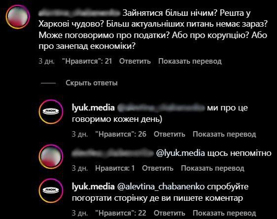 Остання хвиля хейту, згадує Антон Алохінсон з медіа “Люк”, була пов’язана з матеріалом про святкування дня міста в Харкові. Журналісти спростували міфи про дати заснування міста і його звільнення від нацистів. Коментатори в Instagram звинуватили медіа в “дешевому хайпі” та тому, що “Люк” нібито зіпсував настрій “людям, що тішаться своїй належності до чудового міста”. Алохінсон каже, що бурхливу реакцію також викликають матеріали про деколонізацію.