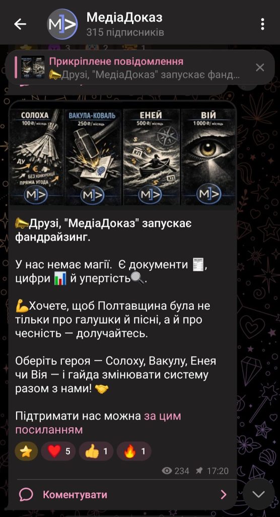 “Нас підтримують міжнародні партнери, ми постійно працюємо з грантами – і це важлива частина нашої роботи. Але ми хочемо мати й підтримку від власної аудиторії, людей, яким важливо, щоб корупція і розкрадання бюджету не були нормою. Ми також розуміємо потребу диверсифікувати доходи, щоб медіа не залежало від одного джерела фінансування. У цьому нам допомогла організація People in Need. Зокрема, завдяки їм ми отримали консультаційну підтримку менторки Марії Леонової (Jnomics Media), з якою ми краще зрозуміли, як може працювати фандрейзинг для регіонального медіа”, – розповіла про ідею Альона Маліченко, головна редакторка видання “МедіаДоказ”.