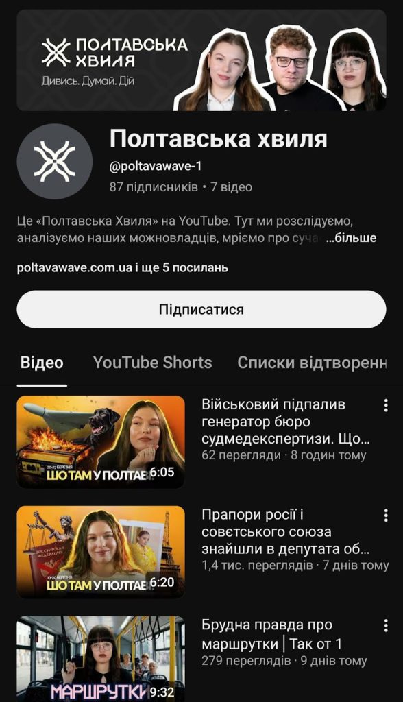 “Ми запустили повністю новий YouTube-канал “Полтавська хвиля”, на якому є кілька форматів: відеорозслідування, новини полтавською говіркою та урбан-блог. Оскільки канал ще зовсім новий, зарано говорити про вимірюваний імпакт чи приріст аудиторії. Однак ми вже зібрали чимало коментарів як під самими відео, так і в особисті повідомлення. Загалом людям зайшли нові формати”, – ділиться Віталій Улибін.