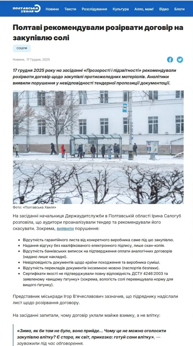 Кінець року відзначився й тим, що в Полтаві посадовець вичитав журналістам за матеріал, а вони знову скаржаться на погану комунікацію влади. У листопаді 2025 року під час брифінгу начальник міського управління ЖКГ Тарас Панасенко звинуватив журналістів видання “Полтавщина” в тому, що редакція помилилася, порівнюючи види солі, яку планує закупити місто. Утім, як виявилося, журналісти не помилилися, а знайшли ще одну схему, оскільки на засіданні “Прозорості і підзвітності” міській владі рекомендували розірвати договір на закупівлю солі, що підтвердило розслідування журналістів. Проте Панасенко вважає, що видання “Полтавщина”, яке зробило розслідування про сіль, публікує власні думки, а не журналістські матеріали.