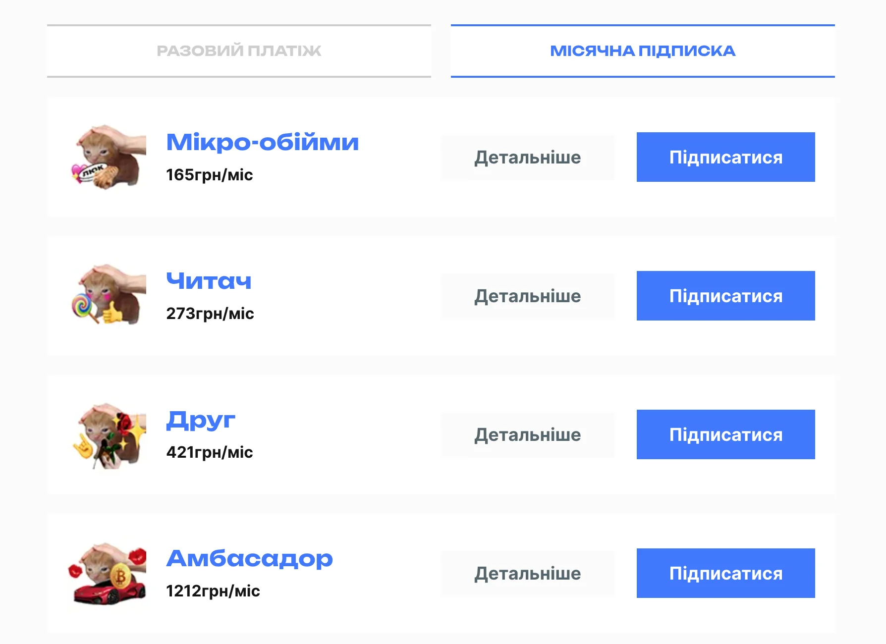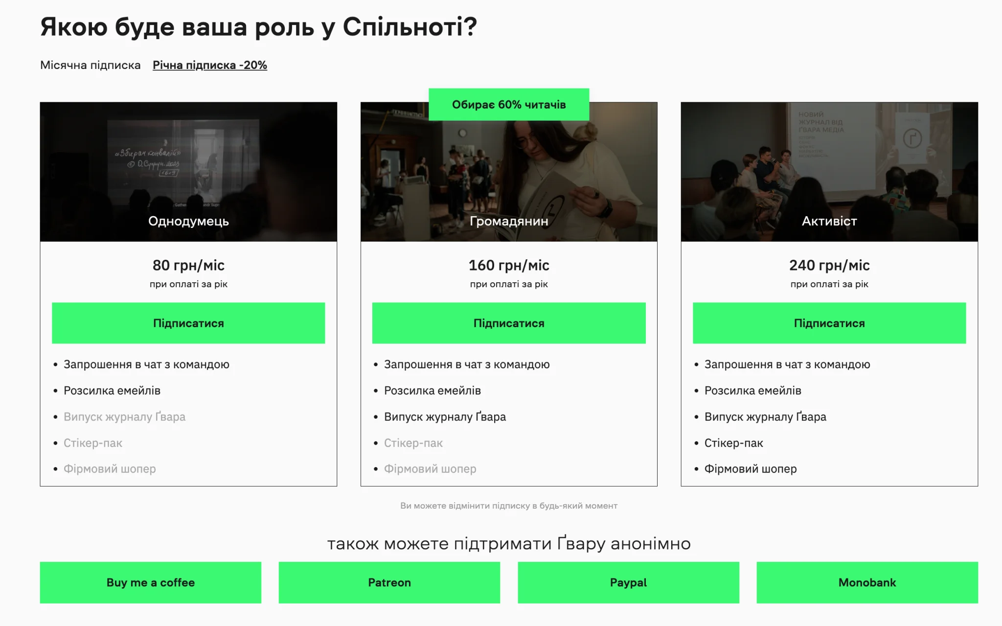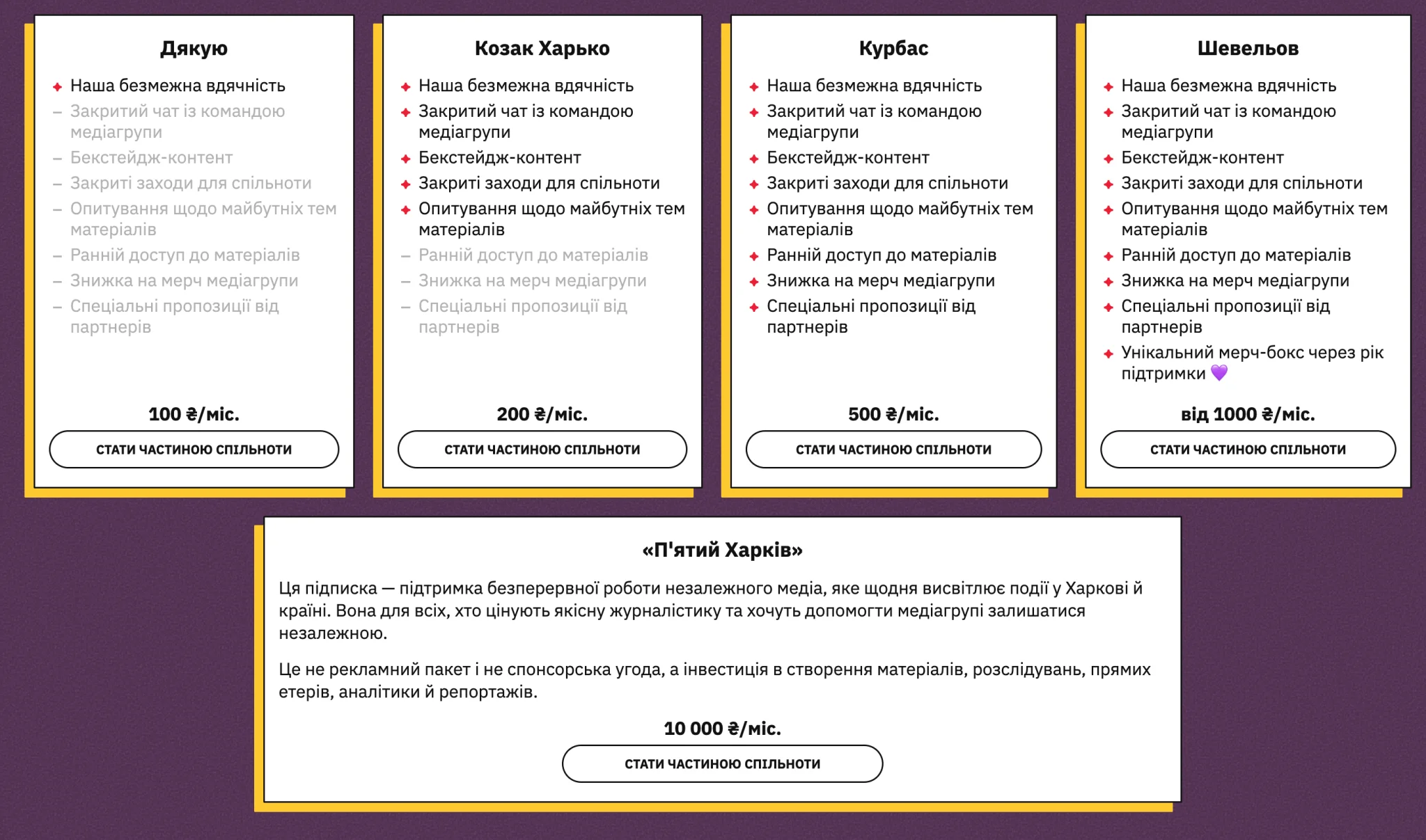 Варіанти підписки в “Люк”. Джерело: сайт “Люк”Медіагрупа “Накипіло” також відкрила спільноту з доступом до закритого чату спільноти, різними типами підписки, закритими подіями лише для спільноти й загалом.