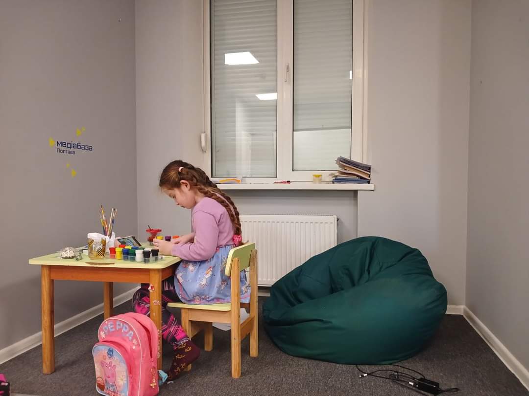 - Облаштували простір для дітей. Щоб журналісти, які мають діток, могли спокійно працювати й перебувати в медіабазі разом з ними. Діти можуть помалювати, поліпити з пластиліну, поскладати пазли, пограти в ігри.