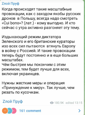 Активна інформаційна кампанія проти Польщі розгорнулася після інцидентів з падінням російських дронів на території країни. Російські телеграм-канали синхронно почали стверджувати, що ці дрони нібито запустила Україна, щоб спровокувати втягування Польщі у війну. До прикладу, популярний канал “Zлой Пруф” ще до акцій протесту писав: “Походу, х-лы, под видом русских дронов, начали бомбить поляков, чтобы втянуть их в войну”. В іншому дописі там же йшлося, що це нібито провокація британських спецслужб – і знову з тією самою метою “втягнути поляків у війну”.