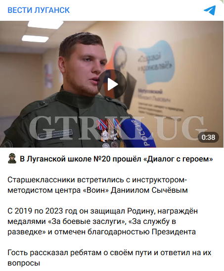 У луганській школі № 20 для старшокласників провели зустріч з Даніілом Сичовим – інструктором центру “Воїн”, який воював у російській армії. Його представляють як приклад “служіння Батьківщині”. Учнів знайомлять з воєнним шляхом “героя”. Сам Данііл наголосив на тому, що дітям важливо зустрічатись і говорити з такими, як він, справжніми “героями”, які мають бути “наставниками” для дітей.