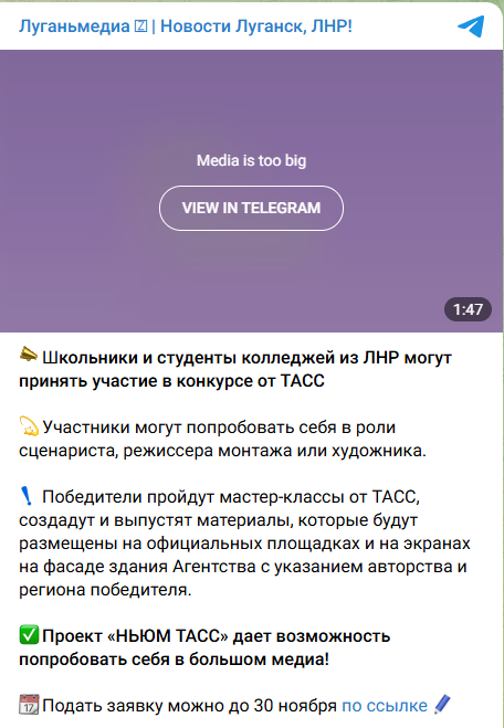 Школярів та студентів коледжів з ТОТ запрошують до участі в конкурсі від російського державного пропагандистського ТАСС. До 30 листопада триває приймання заявок. Формально йдеться про творчі професії: сценаристів, монтажерів, художників. Реально – про інтеграцію дітей у державну систему дистрибуції контенту.