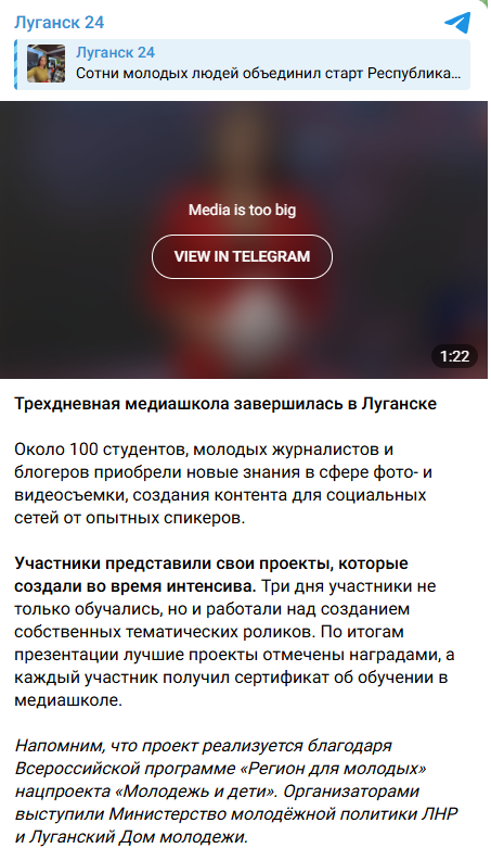 8 листопада в Луганську завершилася триденна “медіашкола”, співорганізатором якої стало окупаційне “міністерство молодіжної політики ЛНР” та незаконно створений “Луганський Дім молоді”. У “медіашколі” взяли участь близько 100 студентів. Програма практична: фото й відео, контент для соцмереж, створення тематичних роликів. Найкращі роботи отримують нагороди, всім видають сертифікати.