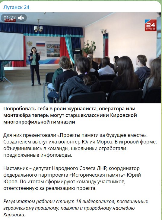 У Кіровській гімназії (місто Голубівка, до декомунізації – Кіровськ), Луганська область, школярів залучили до створення 18 відеороликів про “героїчне минуле Кіровська”. Про це 19 листопада в телеграм-каналі повідомив пропагандистський ресурс “Луганск 24”. Наставник – депутат окупаційної “Народної ради ЛНР”, координатор російського проєкту “Историческая память” Юрій Юров. Підлітки не просто навчаються знімати. Вони навчаються знімати те, що потрібно окупантам: