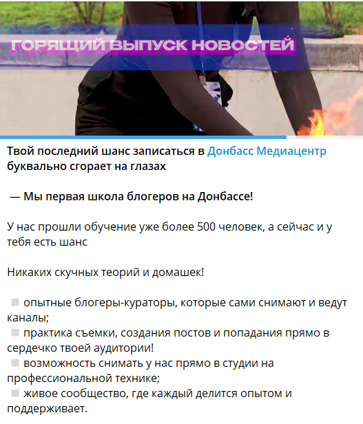 “Перша школа блогерів на Донбасі” (так себе позиціює “Донбас Медіацентр”, створений на окупованих територіях 2024 року для підготовки пропагандистів з-поміж жителів ТОТ, вік яких до 25 років. – Ред.) пропонує підліткам повну свободу – без теорії, лише практика. Викладають проросійські блогери, студію оснащено професійною технікою, є активне ком’юніті.