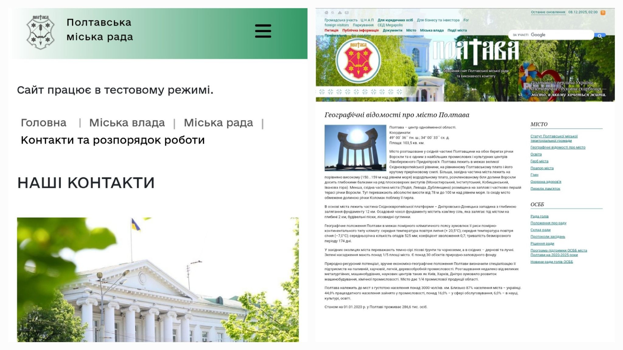 Уявіть ситуацію: ви стоїте під дощем десь біля Корпусного парку в Полтаві, у руці – телефон, Telegram блимає повідомленням від редактора: “Скинь рішення сесії за 2020-й, терміново. Це треба в матеріал зараз”. Ви відкриваєте сайт Полтавської міськради – і одразу провалюєтеся в минуле: дрібний шрифт, який доводиться розтягувати пальцями, верстка “з’їхала”, нескінченні випадаючі меню та архіви в RAR-файлах, які смартфон відмовляється відкривати. Це – реальний досвід роботи з офіційним ресурсом міськради, якому виповнилося вже 18 років. Саме стільки старий сайт, із кількома косметичними “ремонтами”, залишався основним вікном міста до публічної інформації, хоча фактично відрізав від неї всіх, хто звик жити в ритмі мобільного інтернету.