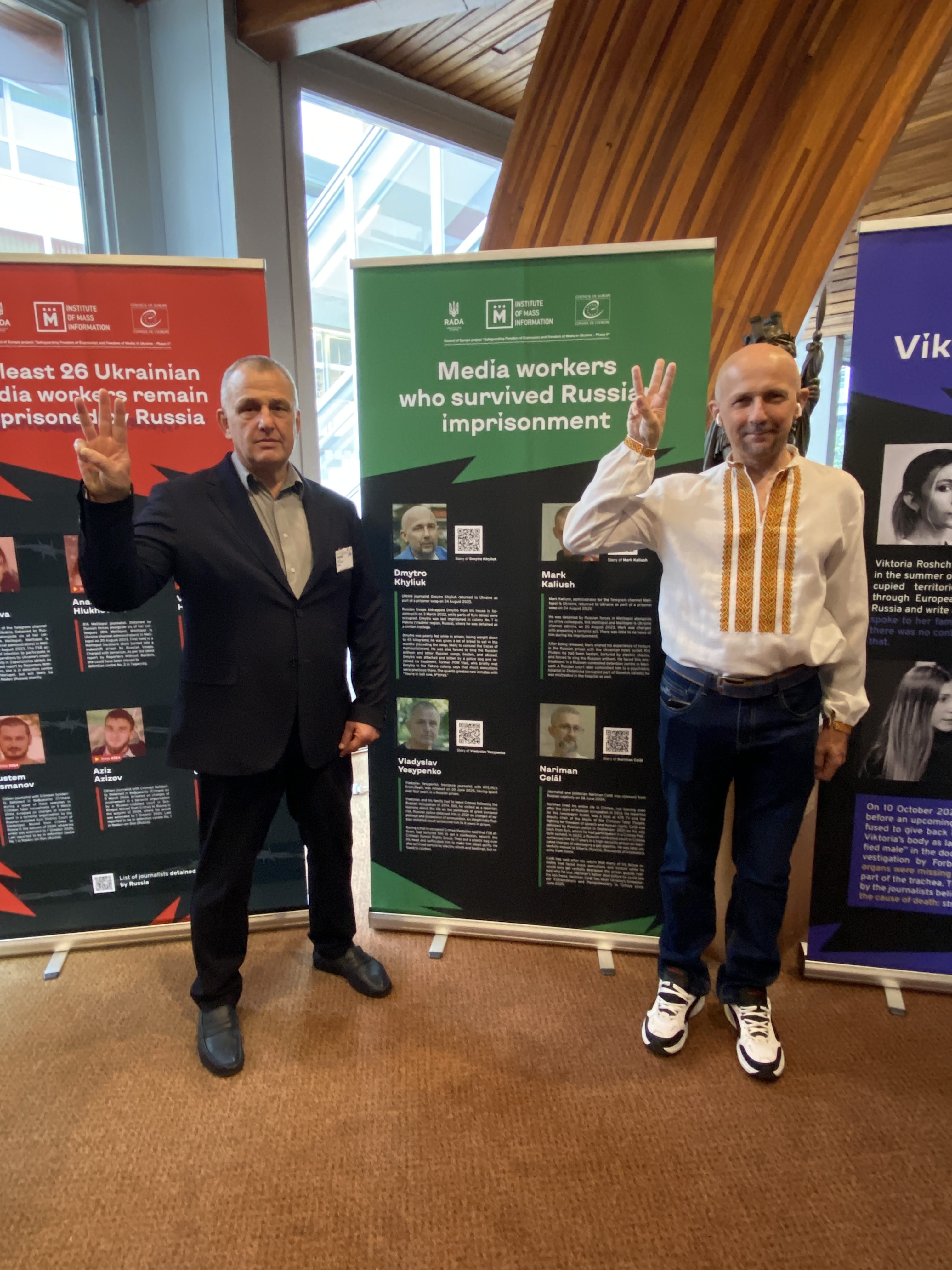 Робота над виставкою Press in Detention кипіла кілька місяців. Щойно ми все підготували, довелося вносити правки. Але це найкращі правки, які можна уявити. Адже 24 серпня, на День Незалежності України, повернувся з полону Дмитро Хилюк. Росіяни тримали його в нелюдських умовах та інформаційному вакуумі з березня 2022 року. Тому з легким серцем я перемістила Дмитра зі стенда про медійників у полоні до стенда про журналістів, які його пережили. А потім ми разом поїхали в Страсбург розповідати його історію.