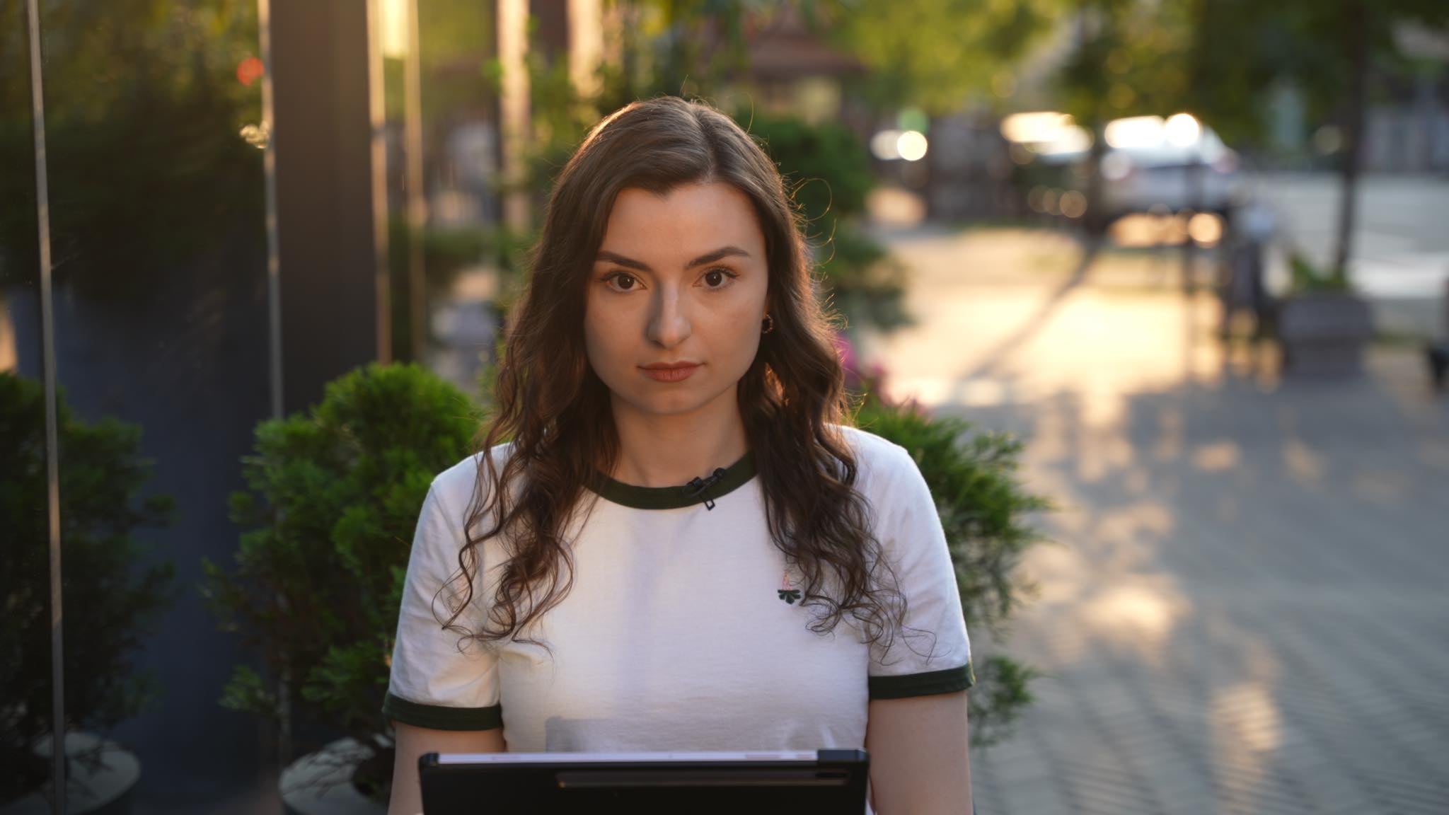 Ira Ponomarenko in safety gear from Mediabaza Chernihiv. Screenshot from Cheline on YouTube by IMI
