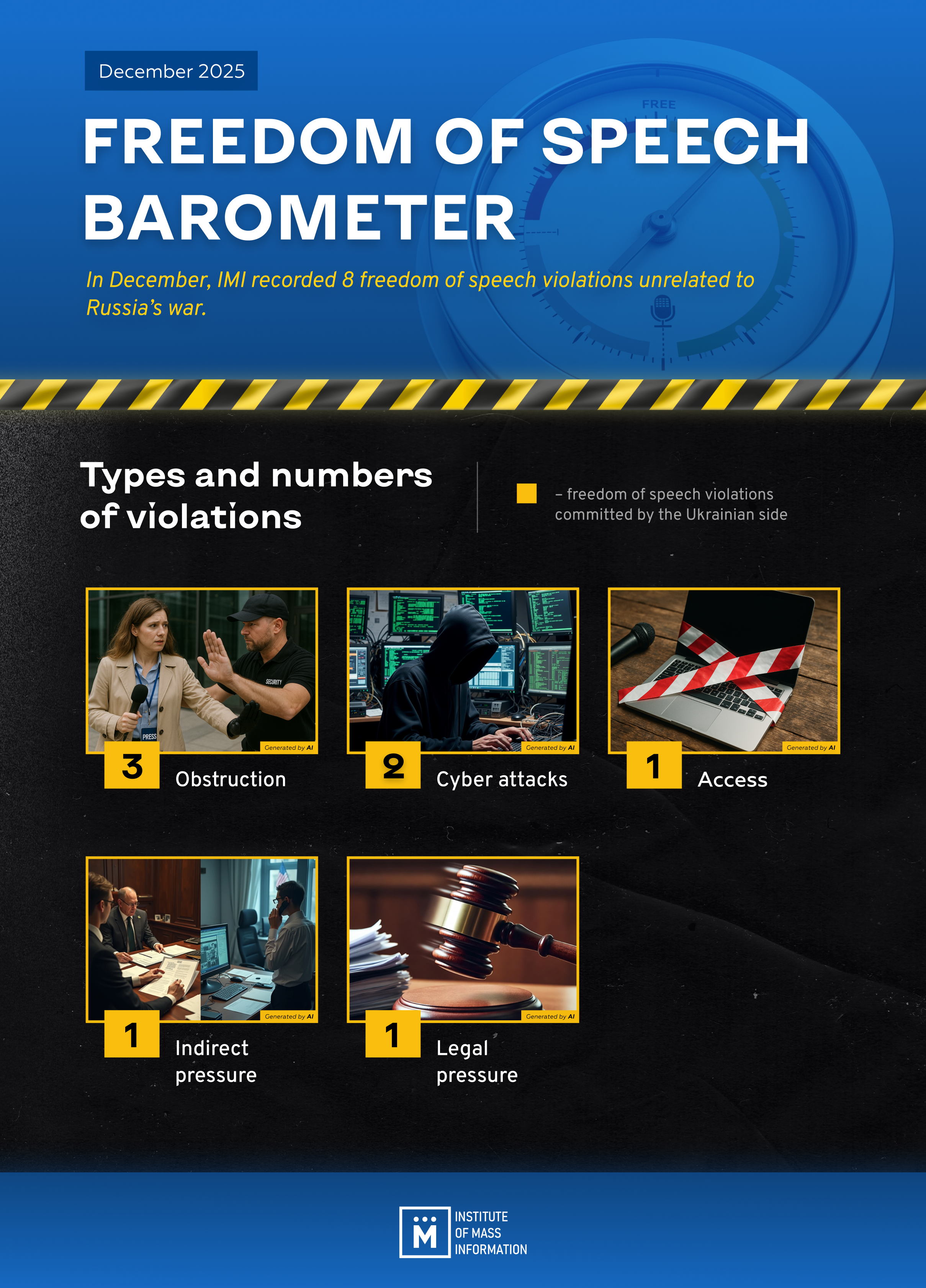 The Institute of Mass Information experts recorded 8 freedom of speech violations in Ukraine in December 2025, all unrelated to Russia’s war on Ukraine, according to the IMI’s monthly monitoring study Freedom of Speech Barometer.