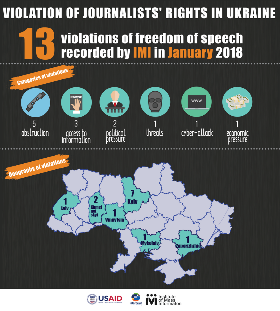 In total, in January IMI regisered 13 cases of freedom of press violations. These violations took place in six regions of the country.In particular, the region with most violations in this month was Kyiv (7 cases).