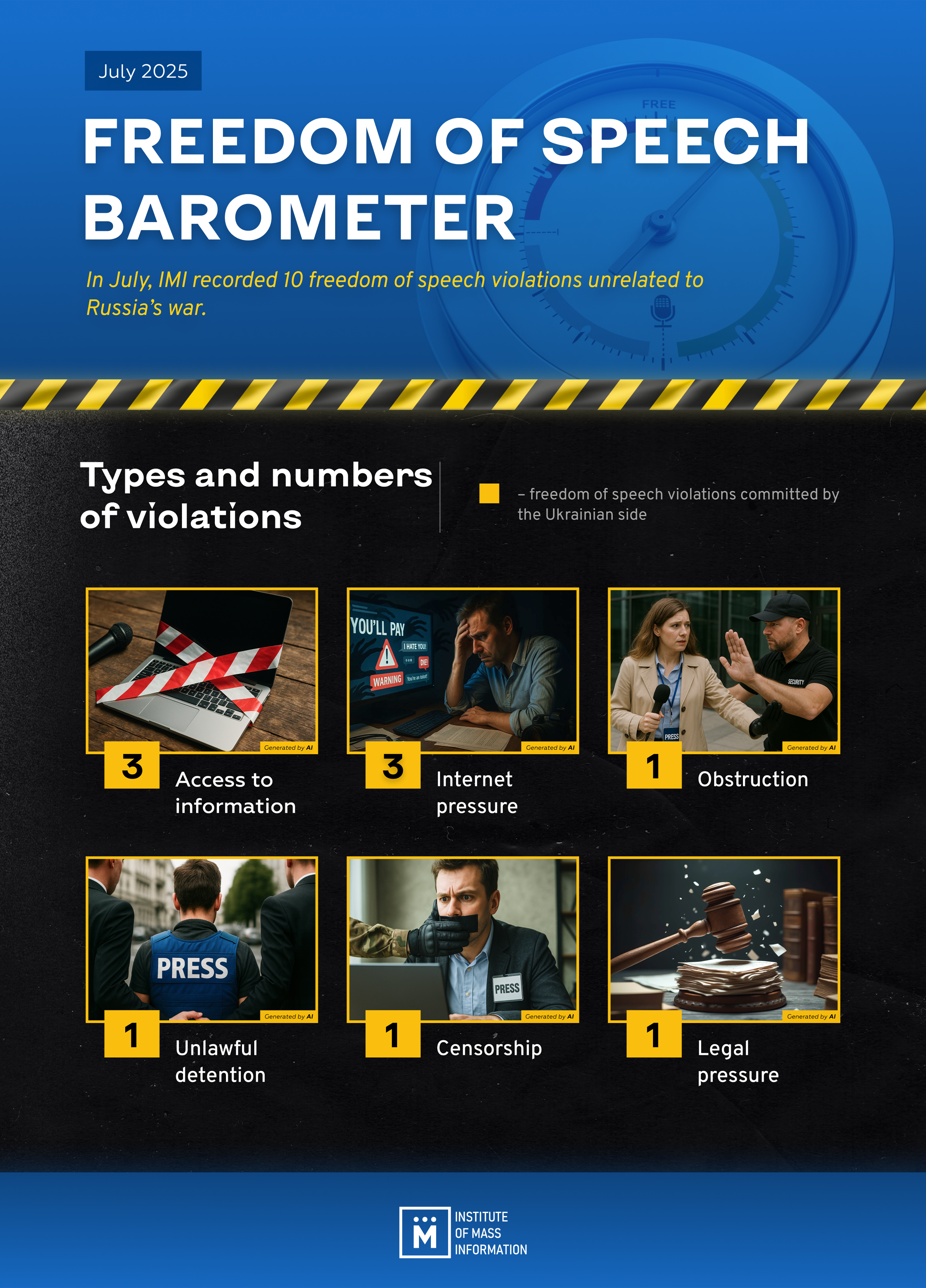 The Institute of Mass Information experts recorded 10 freedom of speech violations in Ukraine in July 2025, according to the IMI’s monthly monitoring study “Freedom of Speech Barometer”. All incidents were unrelated to Russia’s war on Ukraine and were committed by citizens of Ukraine.