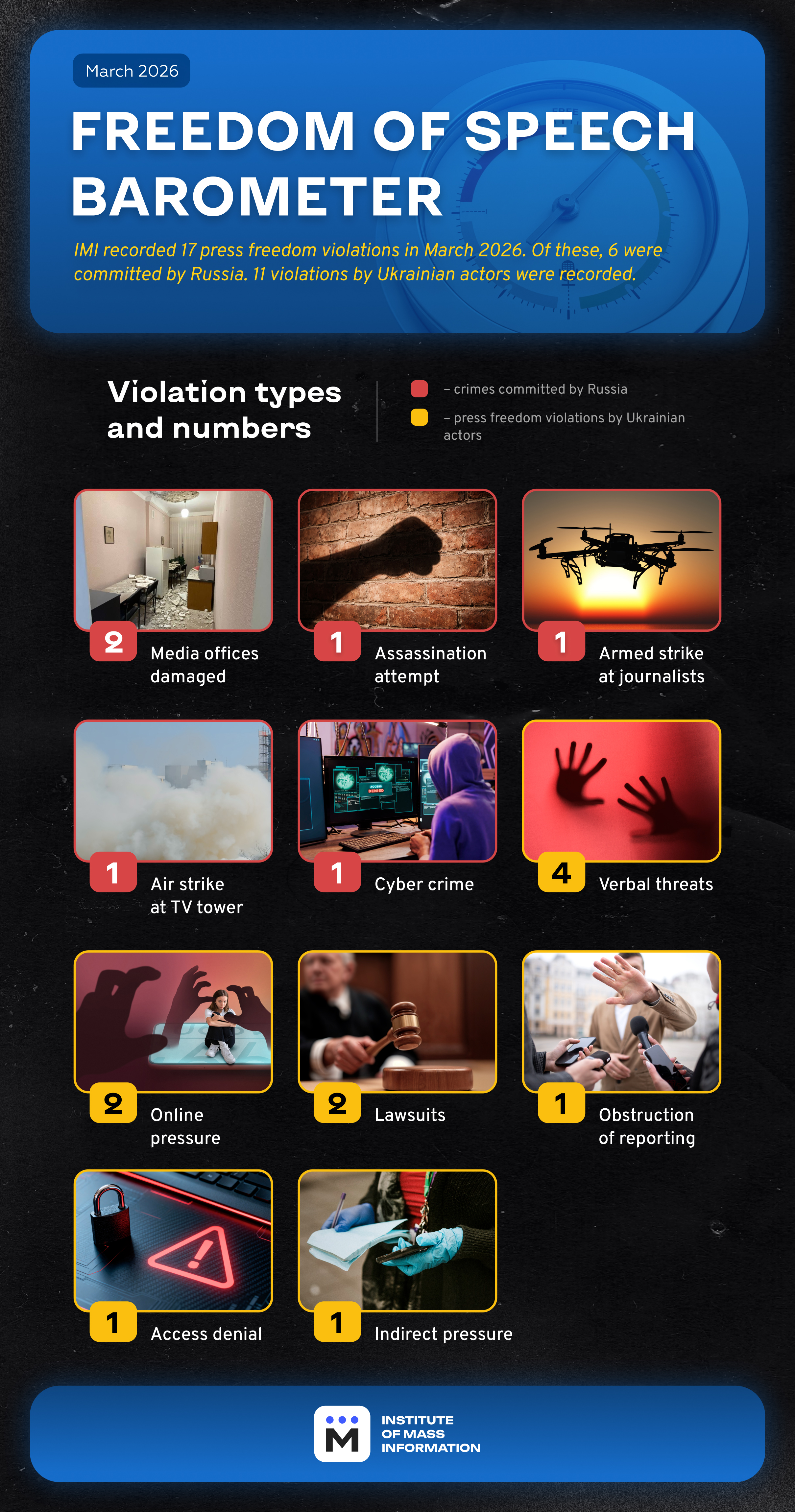 The Institute of Mass Information experts recorded 17 freedom of speech violations in Ukraine in March 2026. Six were committed by Russia, as evidenced by IMI’s monthly monitoring study Freedom of Speech Barometer.