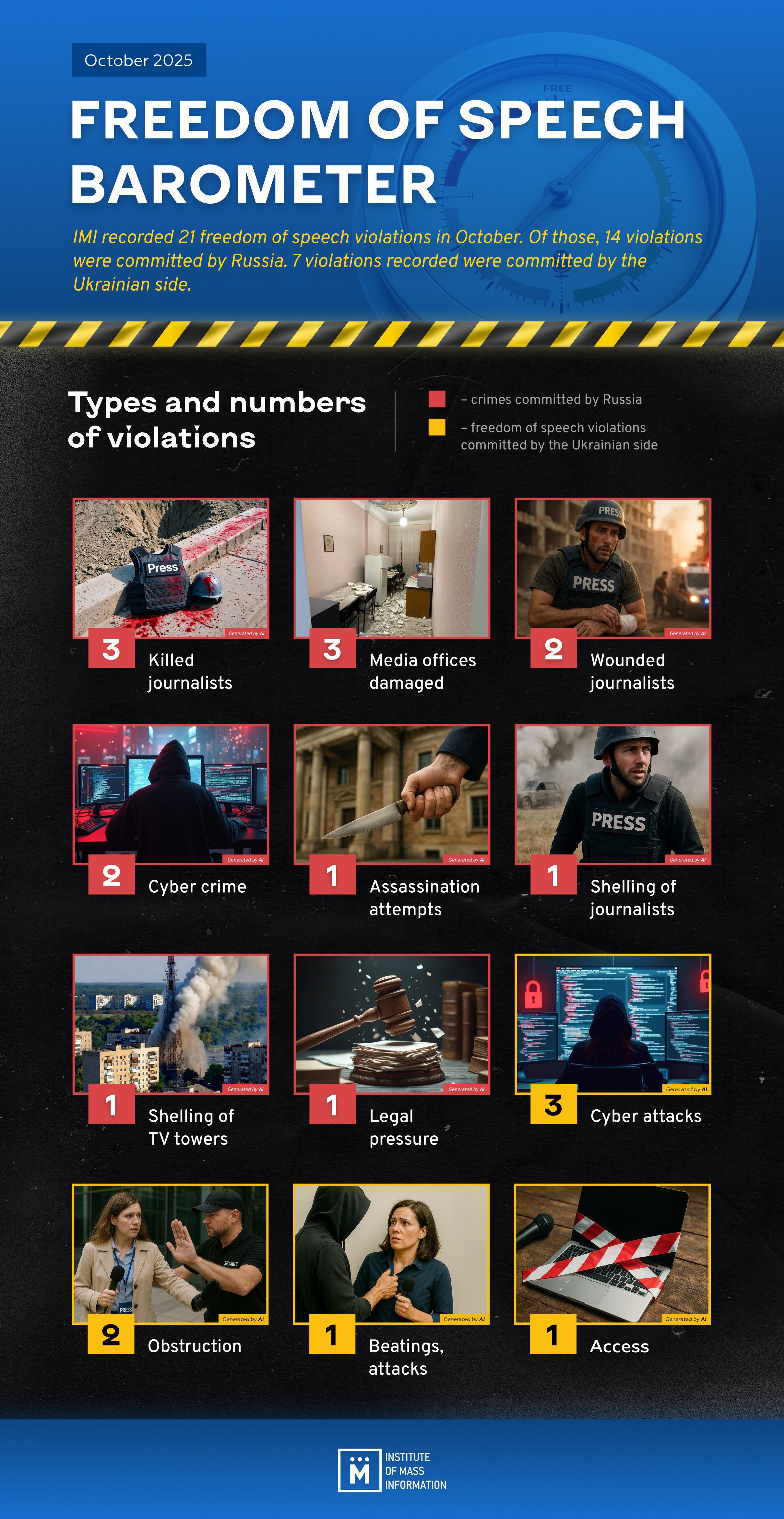 The Institute of Mass Information experts recorded 21 freedom of speech violations in Ukraine in October 2025, with 14 committed by Russia, according to the IMI’s monthly monitoring study Freedom of Speech Barometer.