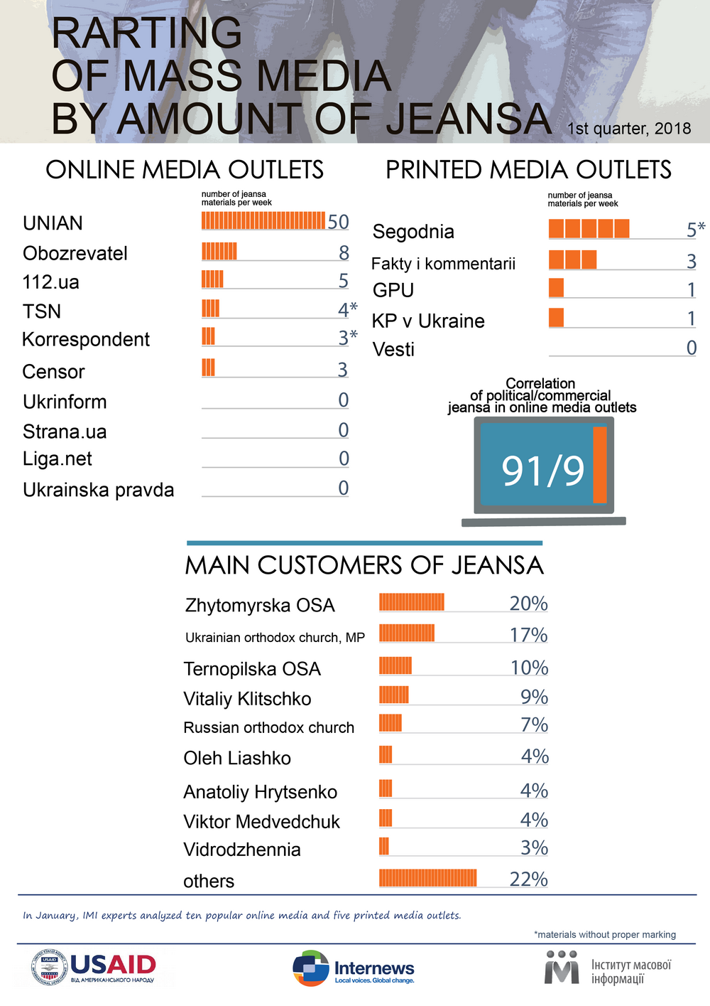 Of all surveyed media outlets, no jeansa was found in four media outlets – “Ukrainska pravda”, “Liga”, “Strana”, and also, in the newspaper “Vesti”.