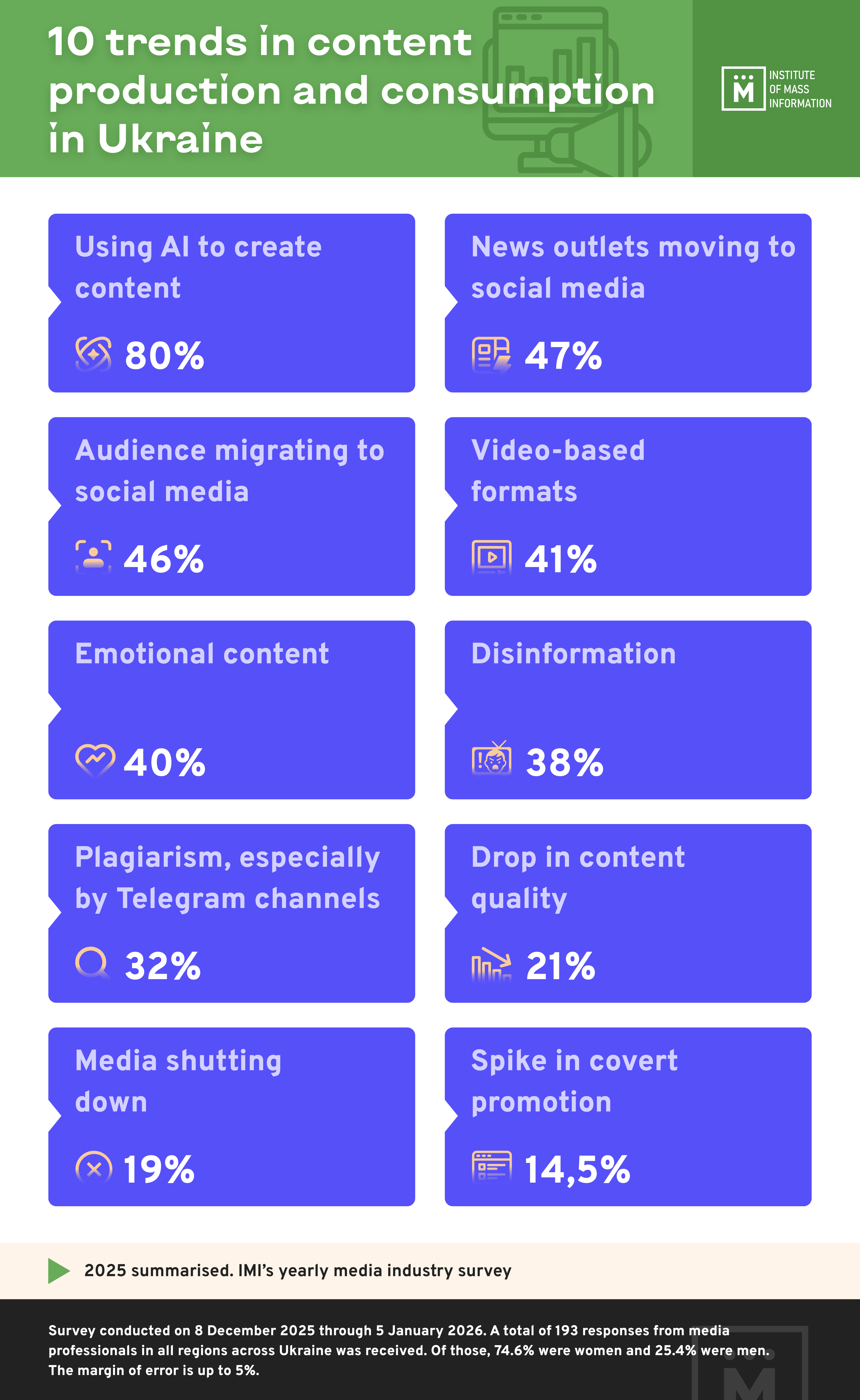 Based on a survey of media professionals, the Institute of Mass Information (IMI) has identified 10 key trends in content production and consumption that defined the way the Ukrainian media industry has evolved amid a full-scale war in 2025. These trends suggest that changes have been stemming not from creative concerns, but from the need to survive in the Ukrainian media market.*