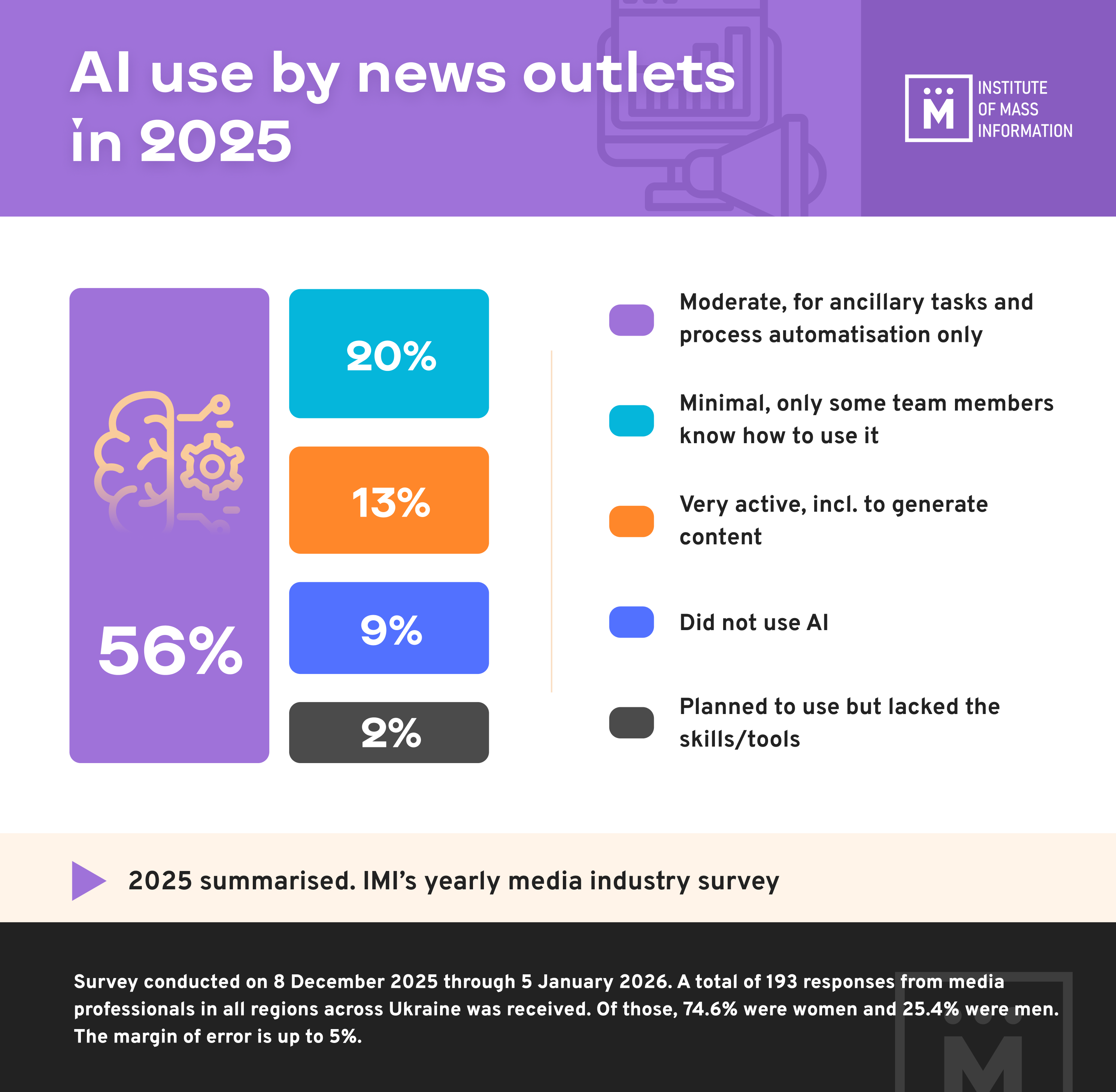 *The study was conducted using a quantitative anonymous online survey method with a simple random sample of potential respondents — journalists and news outlet editors. A total of 193 responses from media professionals in all regions across Ukraine was received. Of those, 74.6% were women and 25.4% were men. The margin of error is up to 5%. The survey was conducted on 8 December 2025 through 5 January 2026.