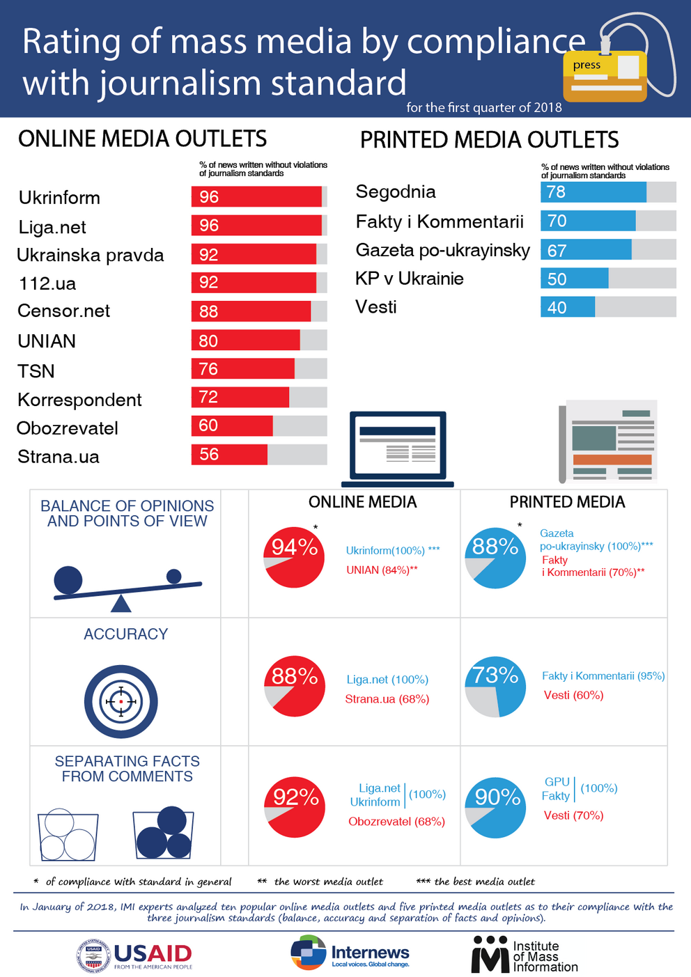 In the first quarter of 2018, the leaders of the rating of adherence to the standards of journalism in online media outlets were two websites – «Liga.net» and «Ukrinform», where 96% of materials were written without violating the standards of journalism. Of the printed media outlets, the leader of adherence to the standards of journalism is newspaper «Segodnia» – 78% of published materials were without violations.