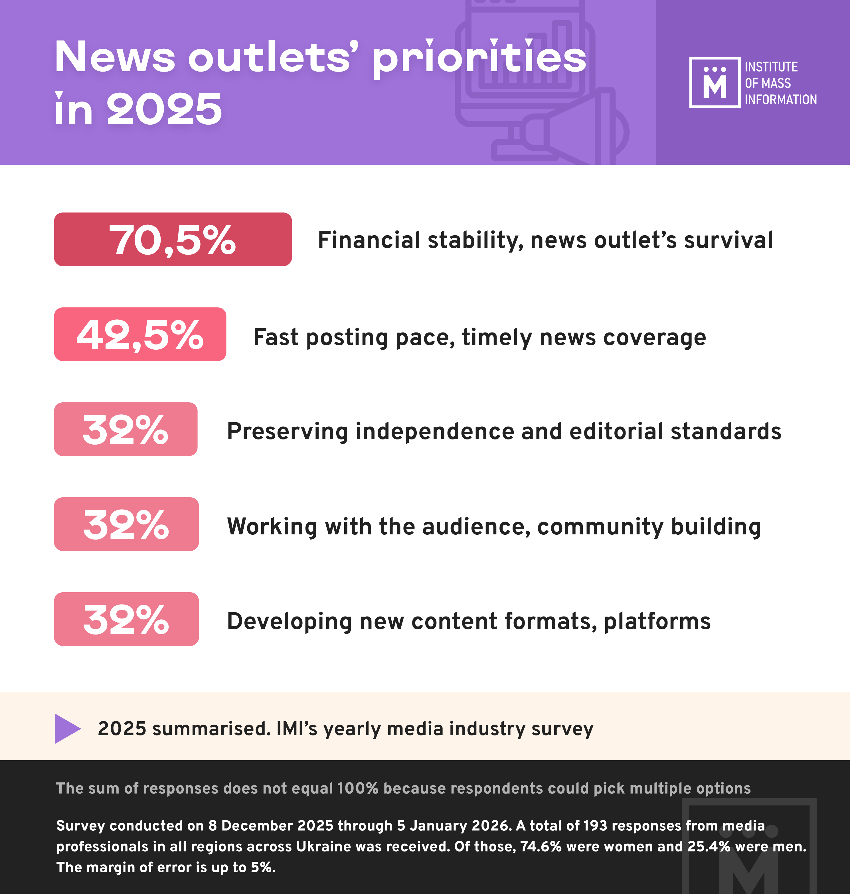 Financial stability and the survival of news outlets was Ukrainain media’s key priority in 2025, as reported by 70.5% of journalists and editors surveyed by IMI. This was primarily achieved through cost optimisation and search for new sources of income in the face of funding cuts and overall economic instability, as evidenced by the anonymous quantitative online survey of journalists conducted by the Institute of Mass Information on 8 December 2025 through 5 January 2026. The survey was formatted as a questionnaire and included 193 journalists in all regions across Ukraine.*