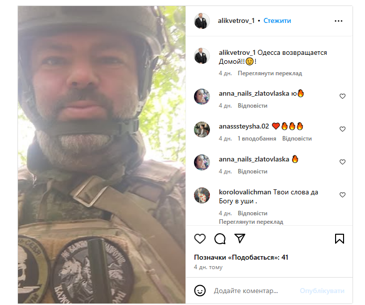 His identity was confirmed by Odesa-based journalists and public activists. Vetrov is open about his participation in the war against Ukraine: he has posted an Instagram photo of himself wearing Russian army uniform and badges.
