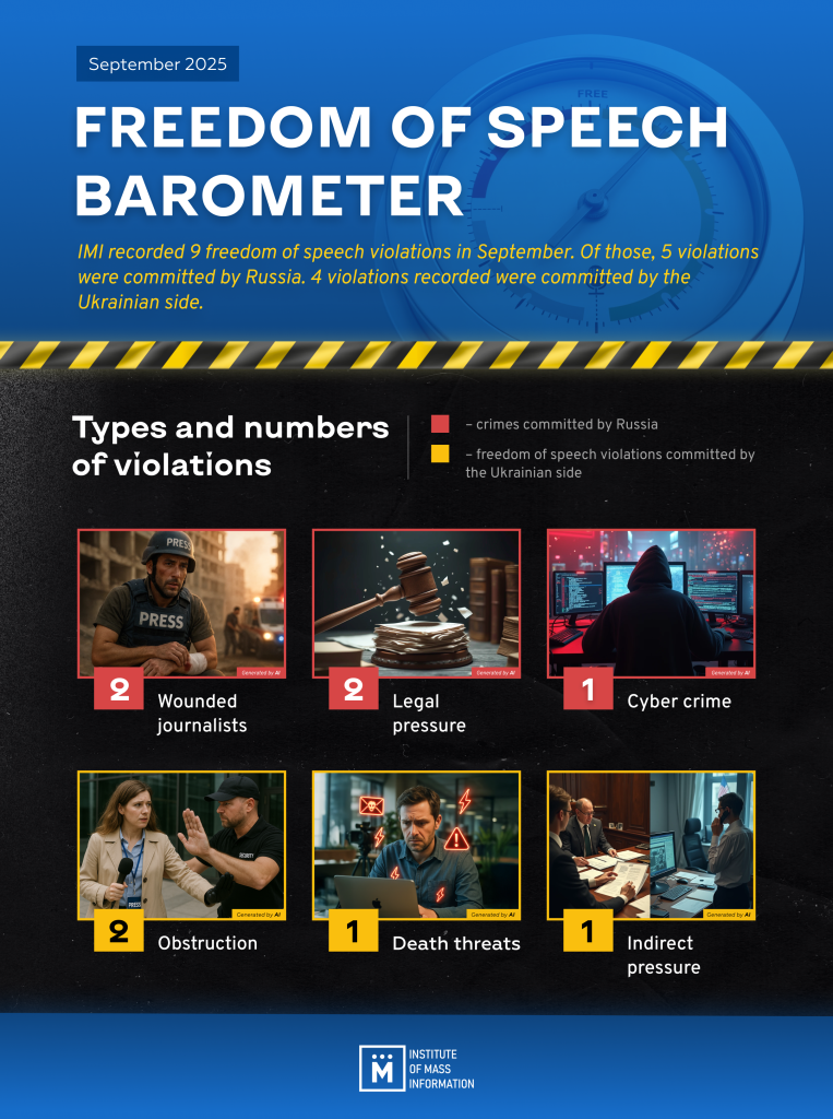The Institute of Mass Information experts recorded 9 freedom of speech violations in Ukraine in September 2025, according to the IMI’s monthly monitoring study Freedom of Speech Barometer.
