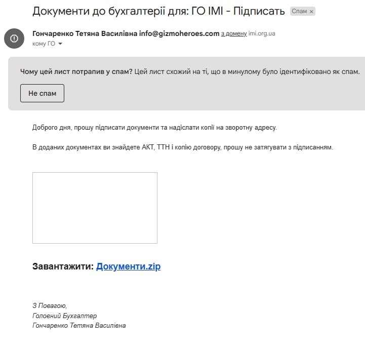 The Institute of Mass Information (IMI) received multiple phishing emails claiming to be from accountants, which arrived to the NGO’s inbox on April 8. The emails were sent by the hacker group UAC-0050, which is affiliated with the Russian intelligence services, as confirmed to the Institute of Mass Information representative Lesya Lutsiuk by the State Computer Emergency Response Team of Ukraine (CERT-UA).