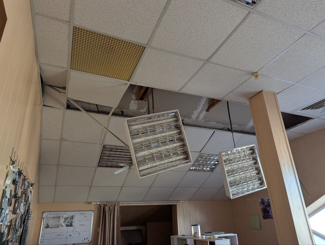 “Some areas of the office building are currently unusable due to the risk of them collapsing further, but we continue to work. Part of the ceiling has crumbled, metal structural elements have been deformed, and light fixtures have been torn from their mounts and are hanging from the ceiling,” the team noted.