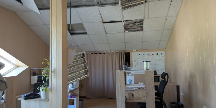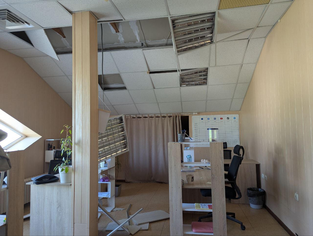 The shock wave damaged the office’s ceiling, deformed the lights, and partially destroyed the interior structures. None of the employees were injured during the shelling.