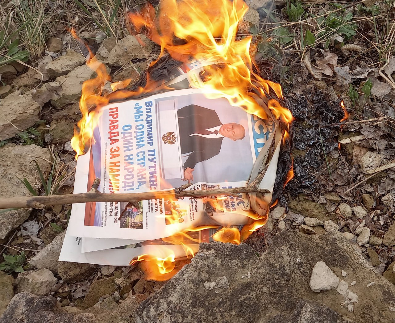 Перейти до Yellow Ribbon activists burn Russian newspapers and propaganda leaflets in the occupied cities of Zaporizhzhia oblast