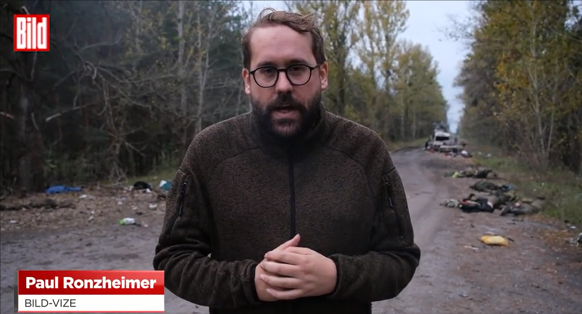 Перейти до Bild correspondent uses dead Russians as background for a stand-up report