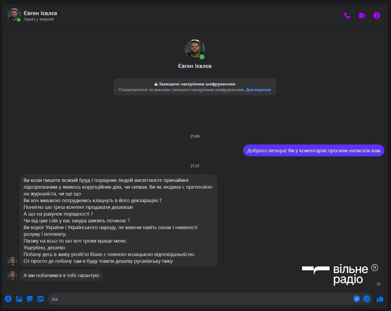 What followed was a private message exchange in which Iyevlev used obscene language. Namely, he claimed that he would “smash the journalist’s f***ing face in” if they met in person. He called Vakulenko “an enemy of Ukraine and of the Ukrainian people” who “sells trash content.”