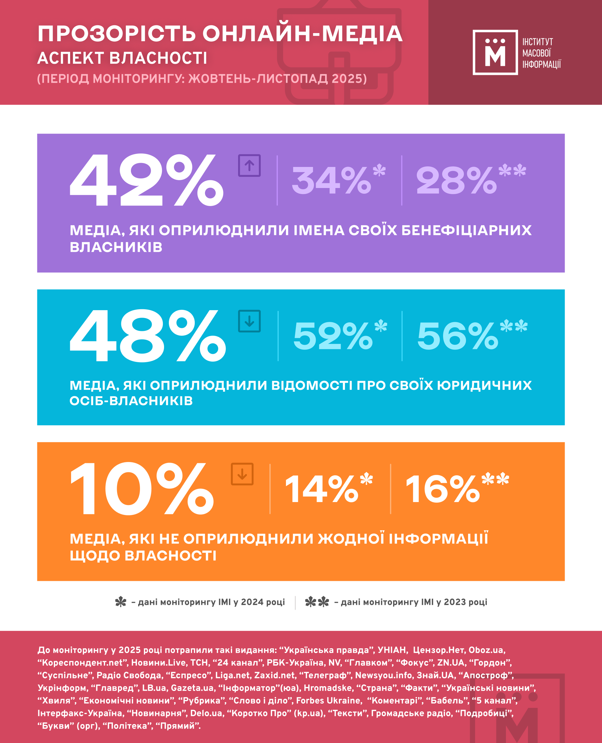 Станом на кінець 2025 року 42% популярних онлайн-медіа України зазначали на своїх сайтах імена фізичних осіб, які є їхніми кінцевими бенефіціарними власниками. З урахуванням аналогічних досліджень Інституту масової інформації за 2023 та 2024 роки простежується стала тенденція до зростання відкритості даних про бенефіціарів медіа: у 2024 році цей показник збільшився на 4%, а у 2025-му – вже на 8%.