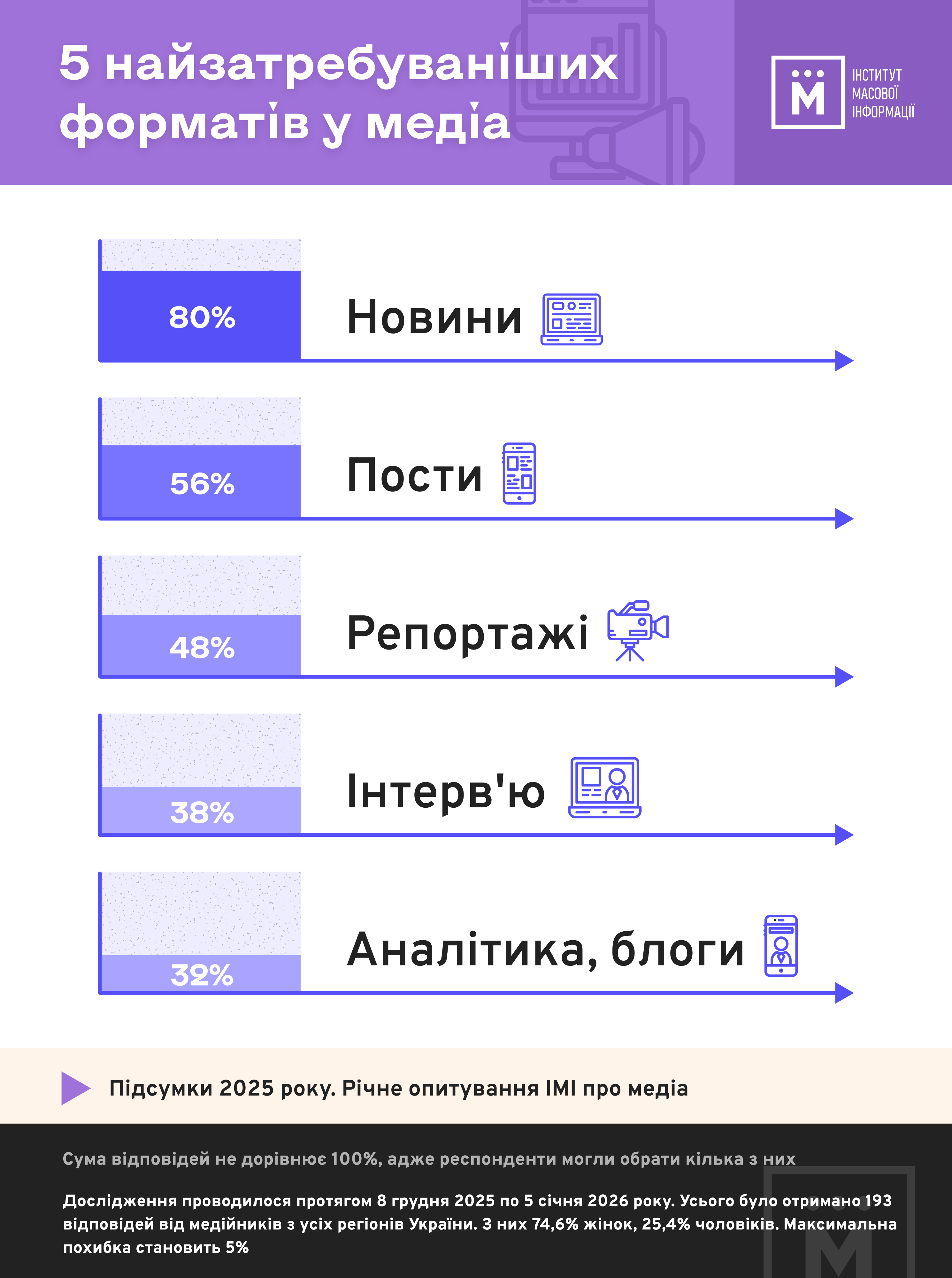 *Дослідження проводилося методом кількісного анонімного онлайн-опитування за простою випадковою вибіркою серед потенційних респондентів – журналістів і редакторів. Усього отримано 193 відповіді від медійників з усіх регіонів України. З них 74,6% жінок, 25,4% чоловіків. Максимальна похибка становить 5%. Дослідження проводилося протягом 8 грудня 2025 – 5 січня 2026 року.